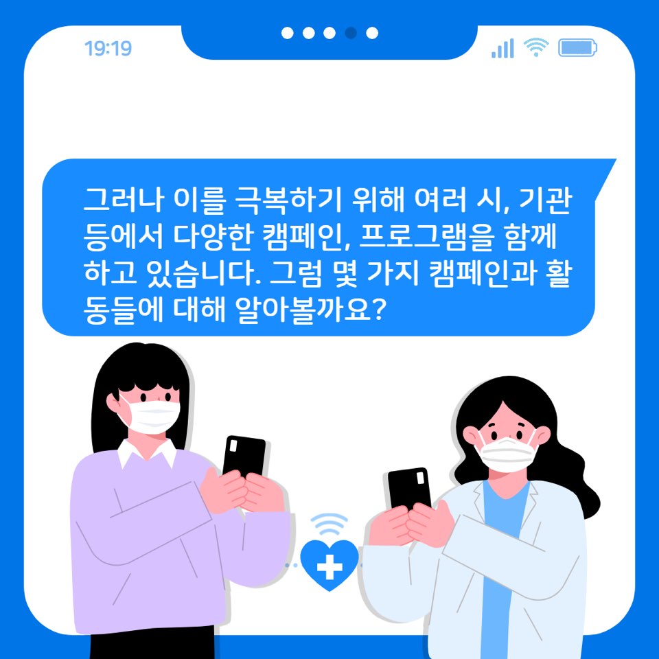 코로나가 예상했던 것보다 길어지고, 그에 따라 코로나 블루를 앓는 사람들이 점차 늘어나고 있습니다. 그러나 이를 극복하기 위해 여러 시, 기관 등에서 다양한 캠페인, 프로그램을 함께하고 있습니다. 그럼 몇 가지 캠페인과 활동들에 대해 알아볼까요?