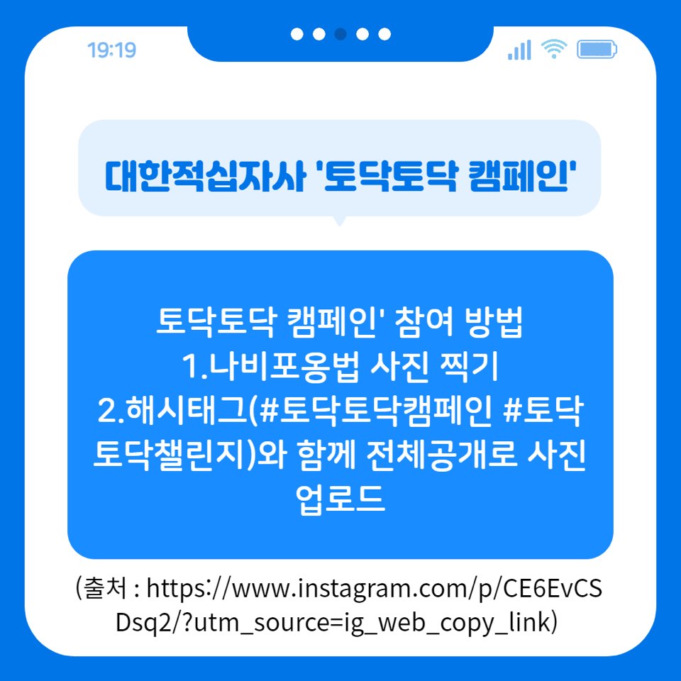 마음 안정에 도움이 되는 '나비포옹법' 사진을 찍어 해시태그(#토닥토닥캠페인 #토닥토닥챌린지)와 함께 SNS에 업로드해 캠페인에 참여할 수 있습니다. 주변의 친구들에게도 '나비포옹법'을 알려주어 함께 코로나 블루를 극복해보아요!