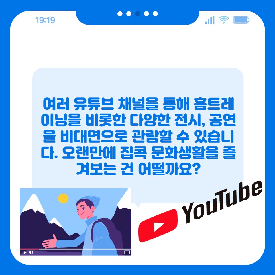 여러 유튜브 채널을 통해 홈트레이닝을 비롯한 다양한 전시, 공연을 비대면으로 관람할 수 있습니다. 오랜만에 집콕 문화생활을 즐겨보는 건 어떨까요?