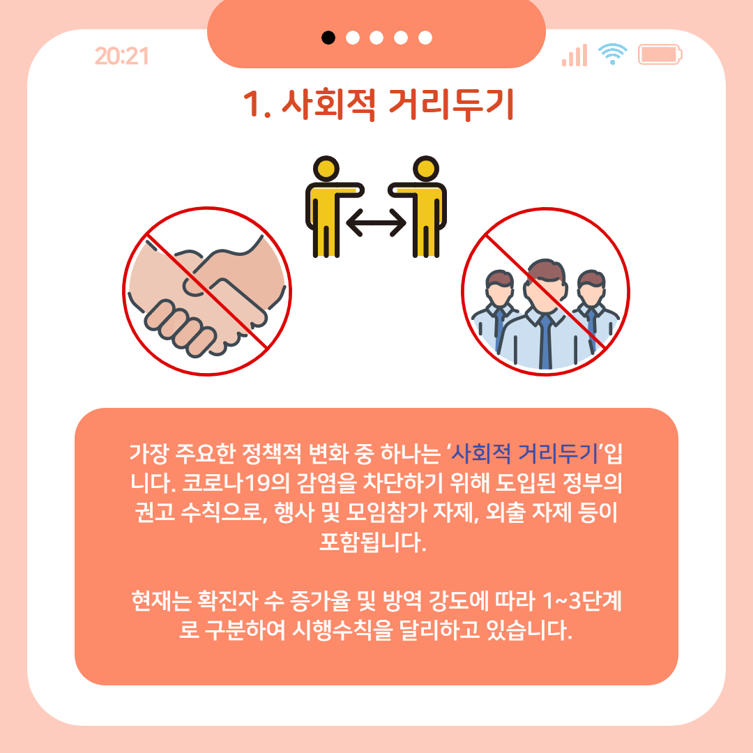 가장 주요한 정책적 변화 중 하나는 ‘사회적 거리두기’입니다. 코로나19의 감염을 차단하기 위해 도입된 정부의 권고 수칙으로, 행사 및 모임참가 자제, 외출 자제 등이 포함됩니다. 현재는 확진자 수 증가율 및 방역 강도에 따라 1~3단계로 구분하여 시행수칙을 달리하고 있습니다.