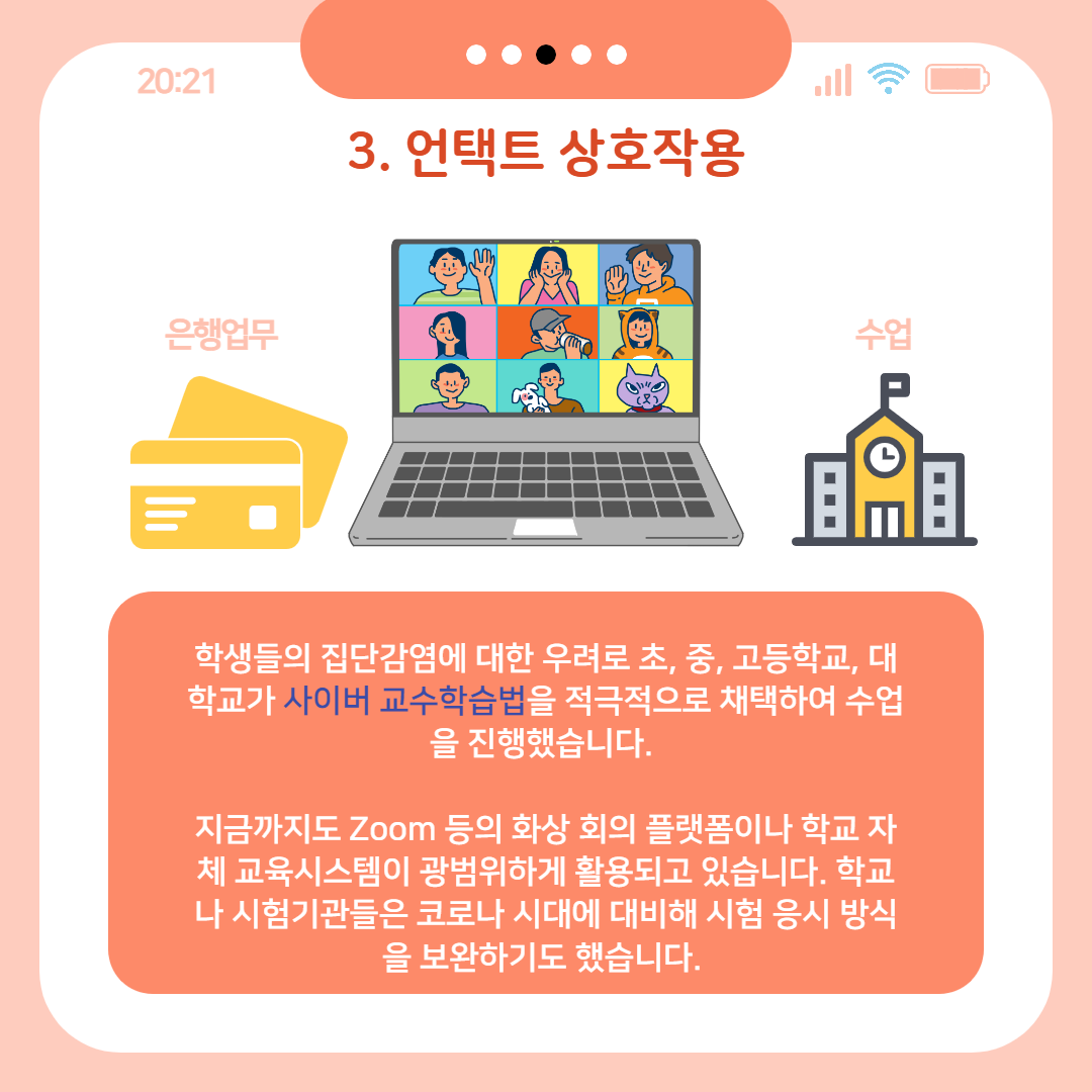 코로나19 확산 우려와 그에 따른 사회적 거리두기 등 정책적 변화로 의사소통하고 업무처리를 하는 방식이 변화했습니다. 많은 기업이나 기관에서 재택근무 및 교대근무 방식을 채택하고, 은행 업무 등 방문이 필요했던 업무도 인터넷을 통해 처리할 수 있게 되었습니다.
