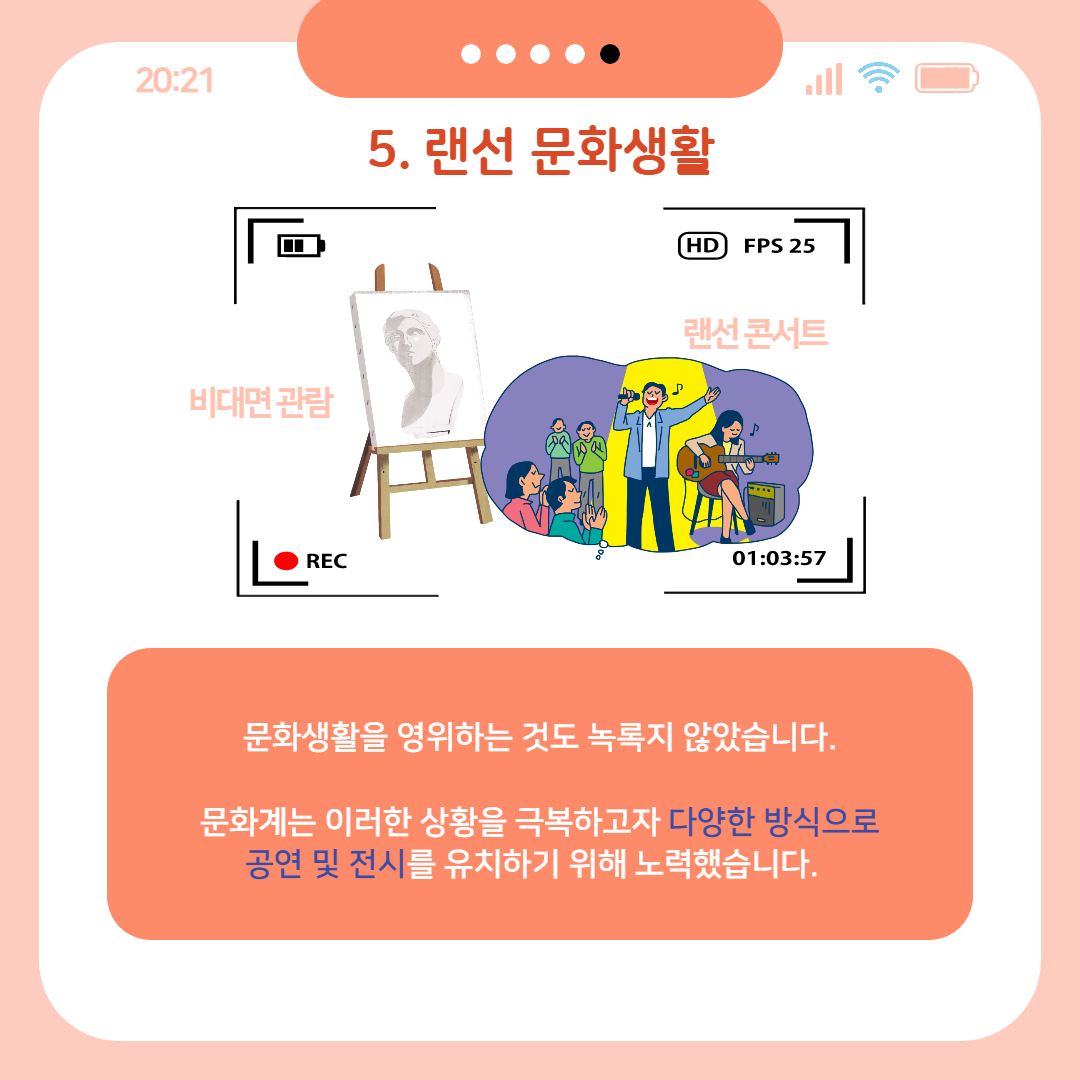 다중이용시설에 가는 것이 어려워졌기 때문에, 문화생활을 영위하는 것도 녹록지 않았습니다. 특히 사람들이 빽빽이 모여 입장하고 공연을 관람하는 콘서트나 뮤지컬 등이 줄줄이 취소되기도 했습니다. 이에 문화계는 이러한 상황을 극복하고자 다양한 방식으로 공연 및 전시를 유치하기 위해 노력했습니다. 많은 아이돌 그룹 및 뮤지컬팀이 실시간 스트리밍을 통해 현장감이 생생한 ‘랜선 콘서트’를 진행했습니다. 전시회의 경우 큐레이터가 작품을 설명하는 것을 영상으로 담아 전달하는 등, 직접 현장에 방문하지 않아도 작품을 즐길 수 있게끔 했습니다.