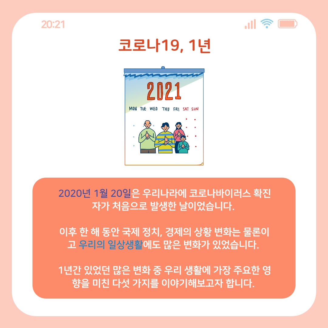 2020년 1월 20일은 우리나라에 코로나바이러스 확진자가 처음으로 발생한 날이었습니다. 이후 한 해 동안 국제 정치, 경제의 상황 변화는 물론이고 우리의 일상생활에도 많은 변화가 있었습니다. 1년간 있었던 많은 변화 중 우리 생활에 가장 주요한 영향을 미친 다섯 가지를 이야기해보고자 합니다.