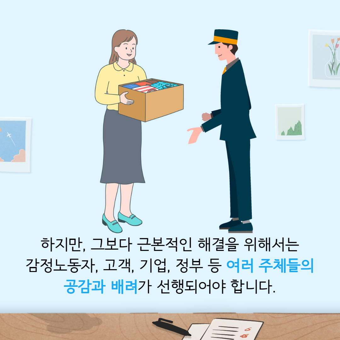 하지만, 그보다 근본적인 해결을 위해선 감정노동자, 고객, 기업, 정부 등 여러 주체들의 공감과 배려가 선행되어야 합니다.