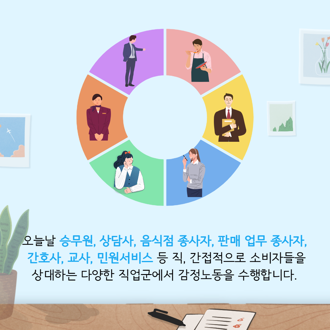 오늘날 승무원, 상담사, 음식점 종사자, 판매 업무 종사자, 간호사, 교사, 민원서비스 등 직접 혹은 간접적으로 소비자들을 상대하는 다양한 직업군에서 감정노동을 수행하고 있습니다.