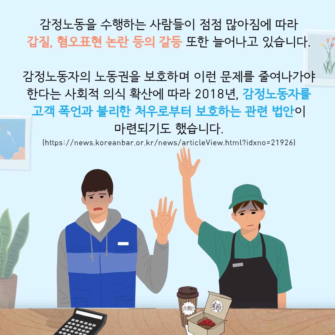 직장, 아르바이트에서 감정노동을 수행하는 사람들이 점점 많아짐에 따라 갑질, 혐오표현 논란 등 감정노동자들의 피해 사례 또한 늘어나고 있습니다.