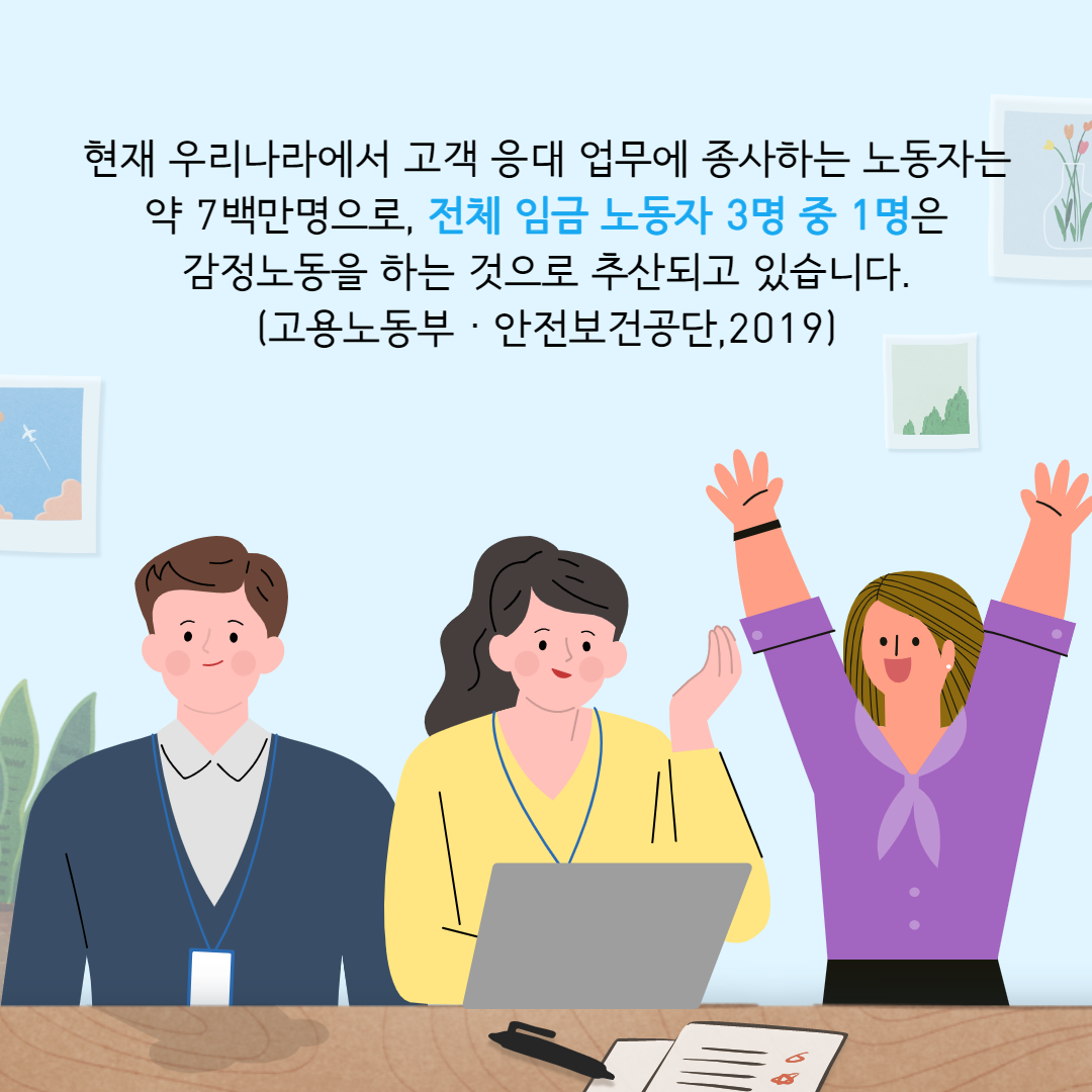 현재 대한민국에서 고객 응대 업무에 종사하는 노동자는 약 7백만명으로, 전체 임금 노동자 3명 중 1명은 감정노동을 하는 것으로 추산되고 있습니다.