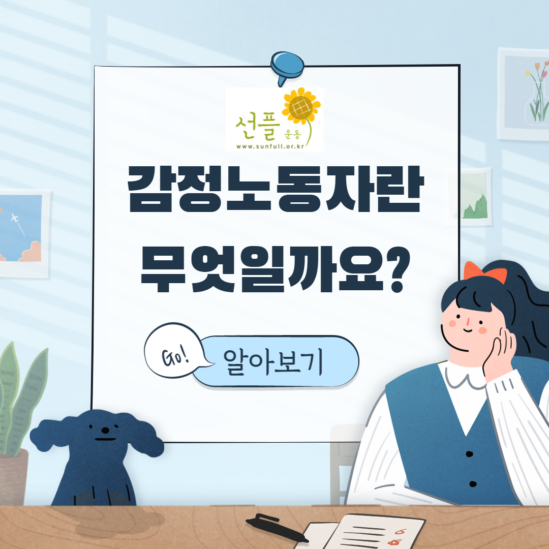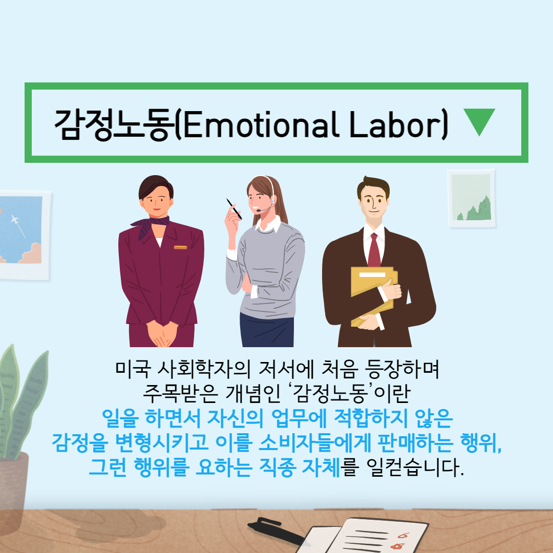 미국의 한 사회학자의 저서로부터 주목받기 시작한 ‘감정노동’(Emotional labor)이란, 사회적 일을 하면서 자신의 업무에 적합하지 않은 감정을 변형시킴과 함께, 이를 소비자들에게 상품으로서 판매하는 행위. 동시에 그런 행위를 요하는 직종 자체를 일컫는 단어입니다.