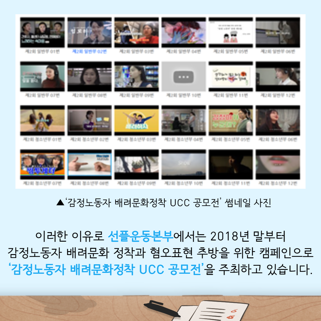 이러한 이유로 선플운동본부에서는 2018년 말부터 감정노동자 배려문화 정착과 혐오표현 추방을 위한 캠페인으로 ‘감정노동자 배려문화정착 UCC 공모전’을 주최하고 있기도 합니다.