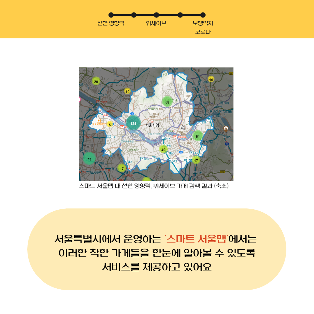 생활정보 및 행정정보, 나아가 우리 사회 선한 영향력을 시각화 하는 스마트 서울맵을 활용해서 우리 동네 착한 가게들과 손잡고 코로나19 함께 극복해요!