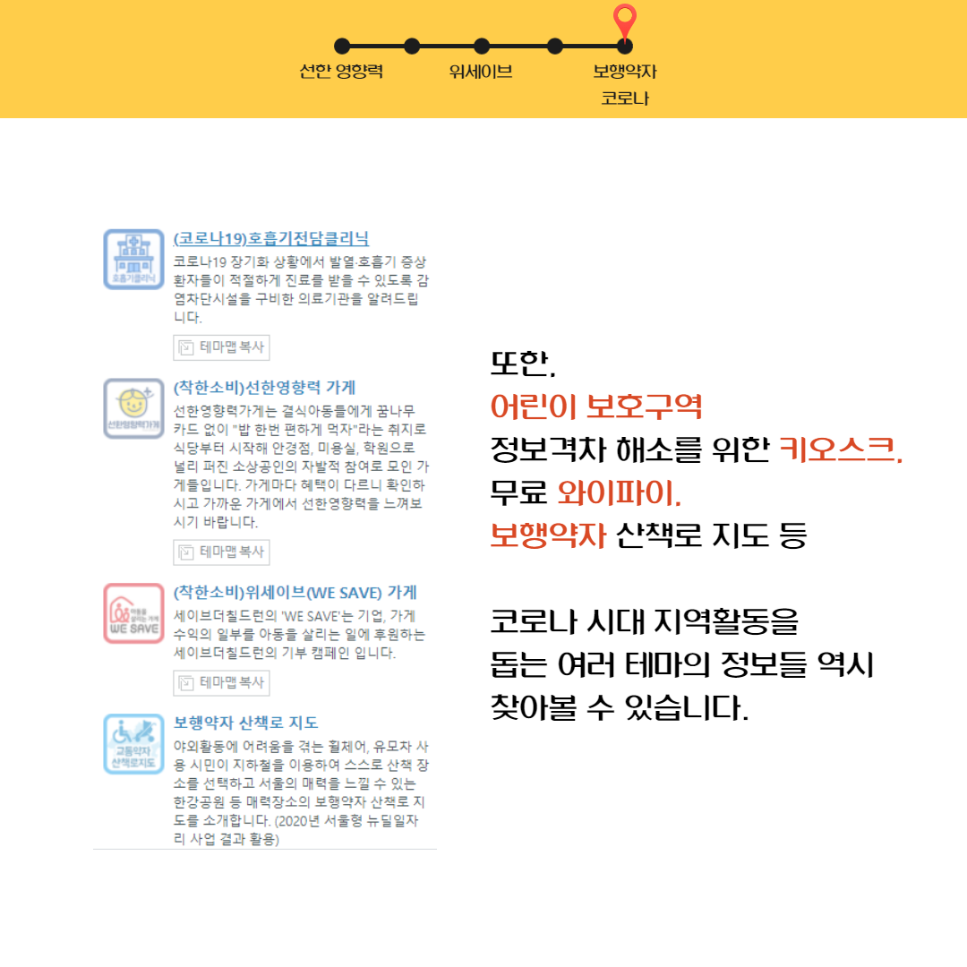 또한, 외국인들을 위한 코로나19 선별 진료소 지도, 어린이 보호구역, 정보격차 해소를 위한 키오스크, 무료 와이파이 지도, 임산부, 노약자, 장애인 등 보행약자를 위한 산책로 지도 등 코로나 시대 지역활동을 돕는 여러 테마의 정보들 역시 찾아볼 수 있습니다.