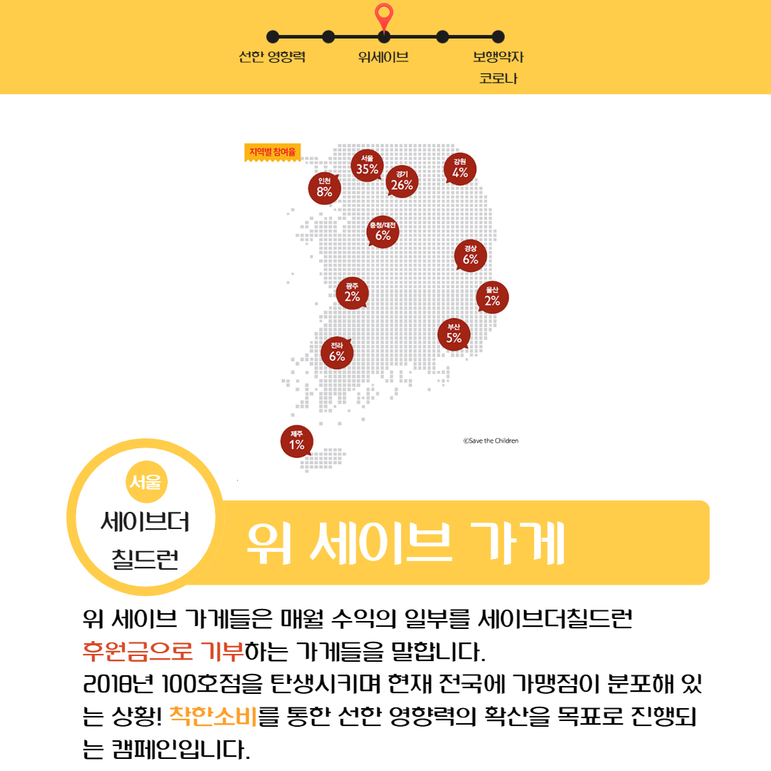 위세이브 가게란, 매장의 매출액의 일부를 세이브더칠드런 후원금으로 기부하며 국내·외 아동들을 위한 나눔활동을 진행하는 가게들을 말합니다. 2018년 100호점을 탄생시키며 현재 전국에 가맹점이 분포해 있는 상황! 착한소비를 통한 선한 영향력의 확산을 목표로 진행되는 캠페인입니다.