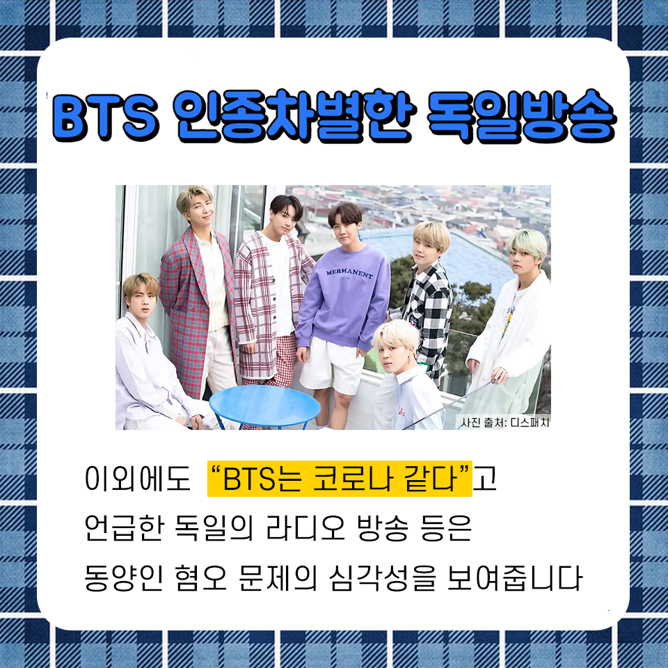4. BTS 인종차별한 독일방속: 이외에도 “BTS는 코로나 같다”고 언급한 독일의 라디오 방송 등은 동양인 혐오 문제의 심각성을 보여줍니다.