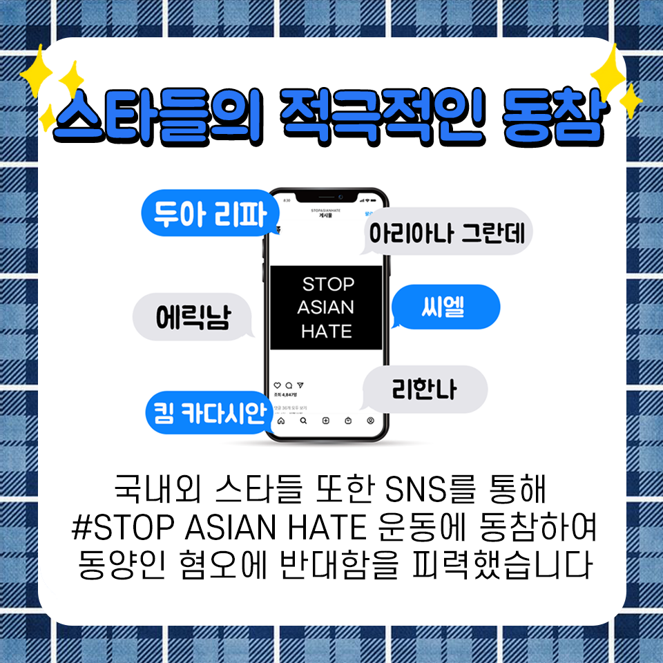 6. 스타들의 적극적인 동참: 국내외 스타들 또한 SNS를 통해 #STOP ASIAN HATE 운동에 동참하여 동양인 혐오에 반대함을 피력했습니다.
