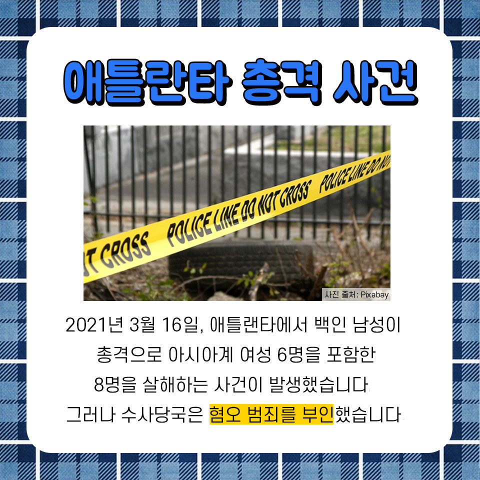 3. 애틀란타 총격 사건: 2021년 3월 16일, 애틀란타에서 백인 남성이 총격으로 아시아계 여성 6명을 포함한 8명을 살해하는 사건이 발생했습니다. 그러나 수사당국은 혐오 범죄를 부인했습니다.