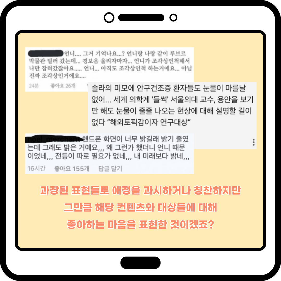 과장된 표현들로 애정을 과시하거나 칭찬하지만 그만큼 해당 컨텐츠와 대상들에 대해 좋아하는 마음을 표현한 것이겠죠?