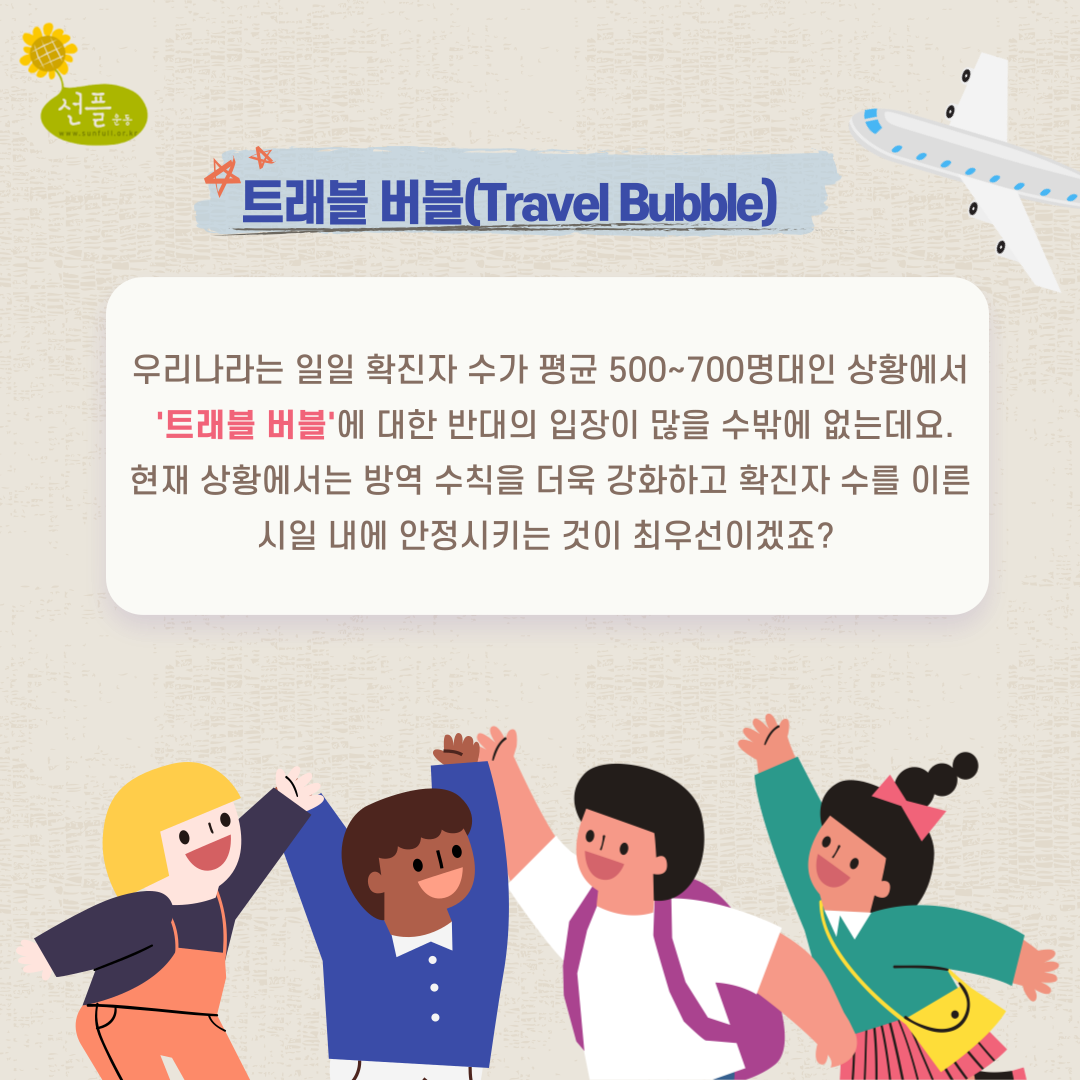 : 우리나라는 일일 확진자 수가 평균 500~700명대인 상황에서 ‘트래블 버블’에 대한 반대의 입장이 많을 수 밖에 없는데요. 현재 상황에서는 방역 수칙을 더욱 강화하고 확진자수를 이른 시일 내에 안정시키는 것이 최우선이겠죠?