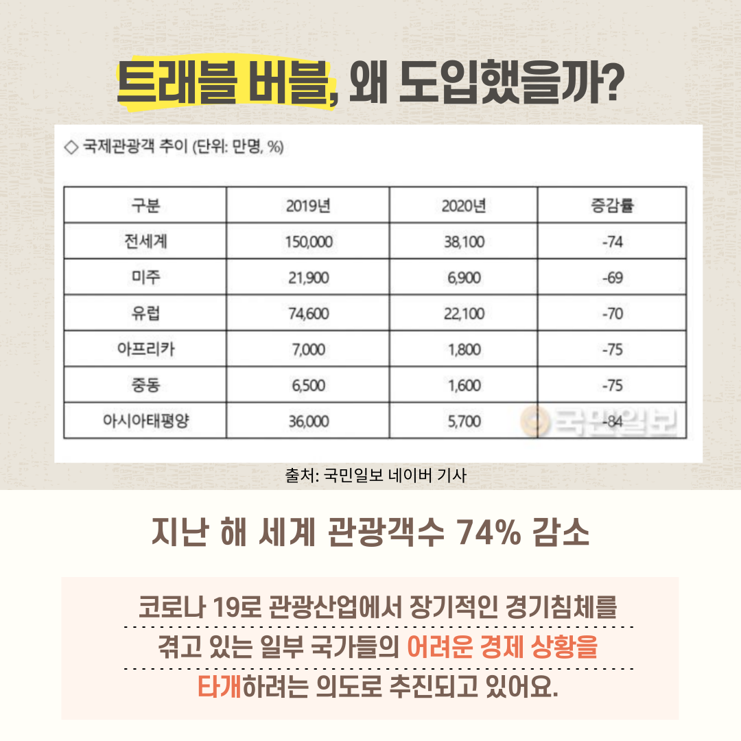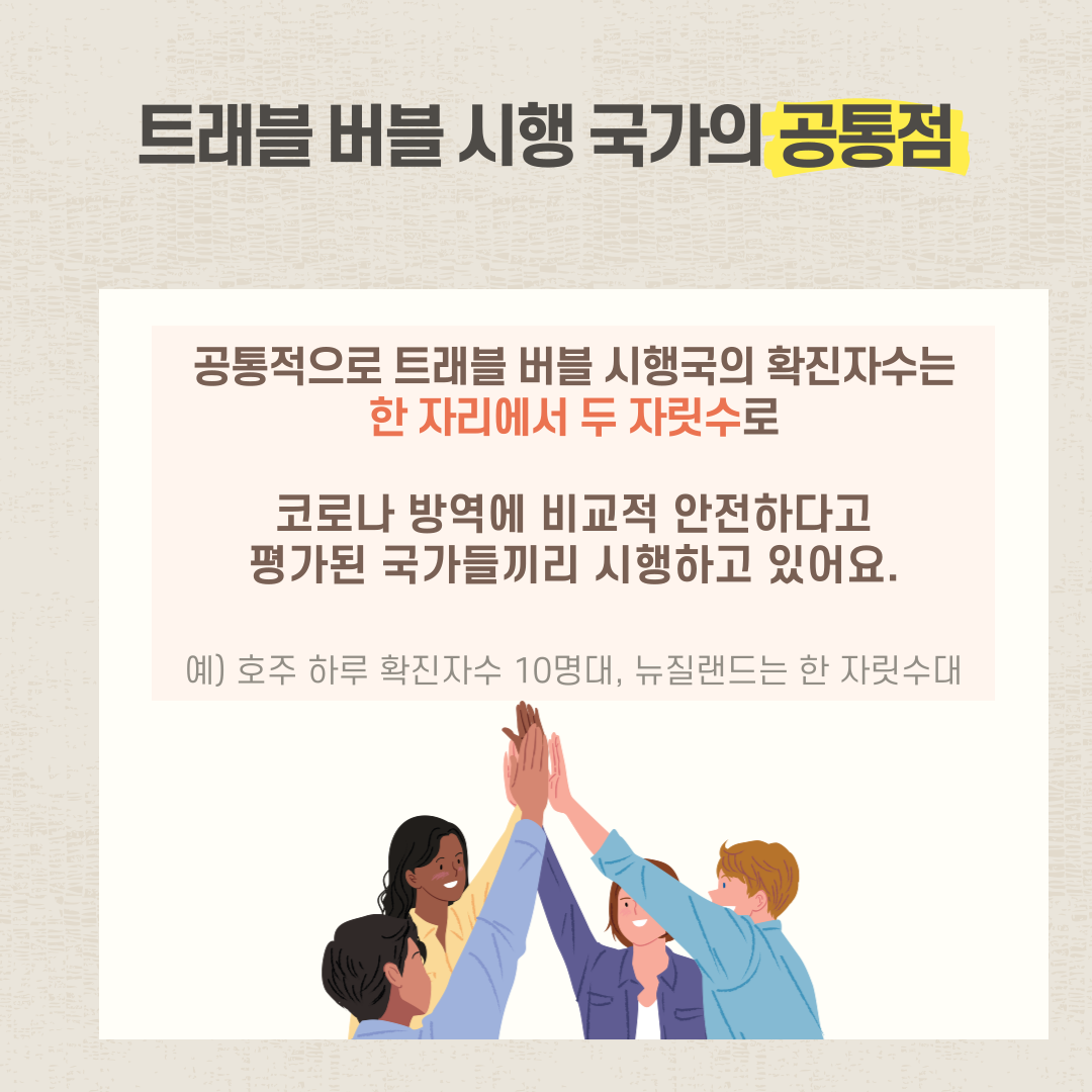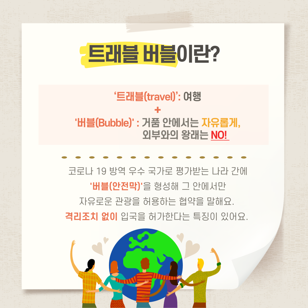 : 트래블(travel): 여행/ 버블(bubble): 거품 안에서는 자유롭게, 외부와의 왕래는 No!
