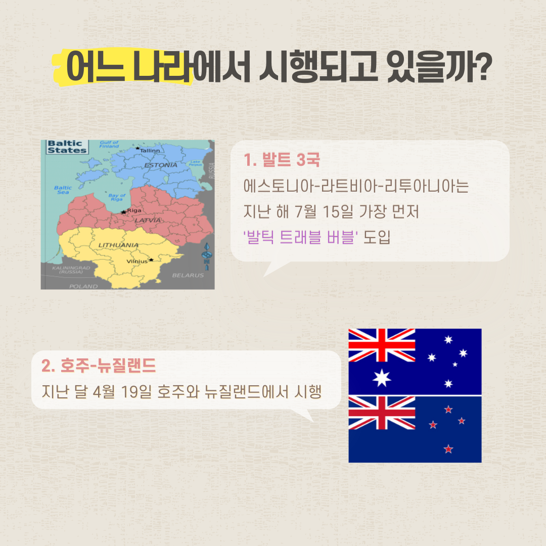 코로나 19 방역 우수 국가로 평가받는 나라 간에 ‘버블(안전막)’을 형성해 그 안에서만 자유로운 관광을 허용하는 협약을 말해요. 격리조치 없이 입국을 허가한다는 특징이 있어요.
