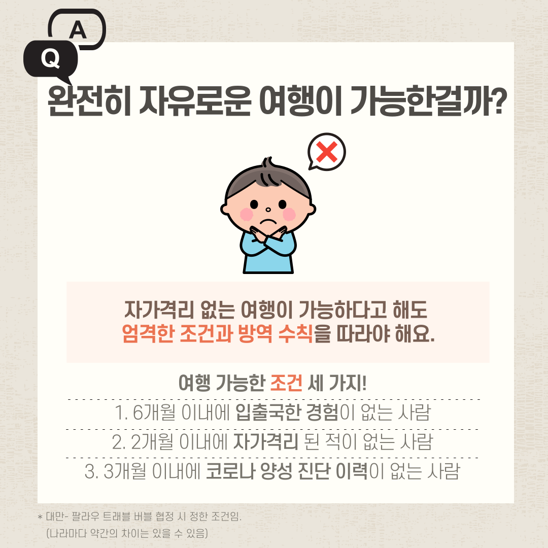자가격리 없는 여행이 가능하다고 해도 엄격한 조건과 방역 수칙을 따라야해요.