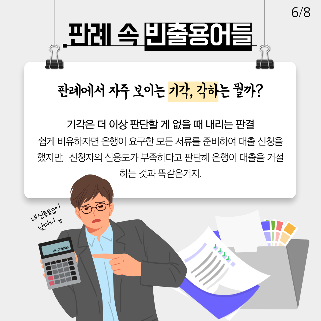 기각의 경우 형식적인 요건을 갖췄지만 실체적인 내용이 없다고 인정 돼 소송종료의 효과를 가져오는 결정을 말합니다. 쉽게 비유하자면, 은행이 요구한 모든 서류를 준비하여 대출 신청을 했지만, 신청자의 신용도가 부족하다고 판단하여 은행이 대출을 거절하는 것과 같습니다.