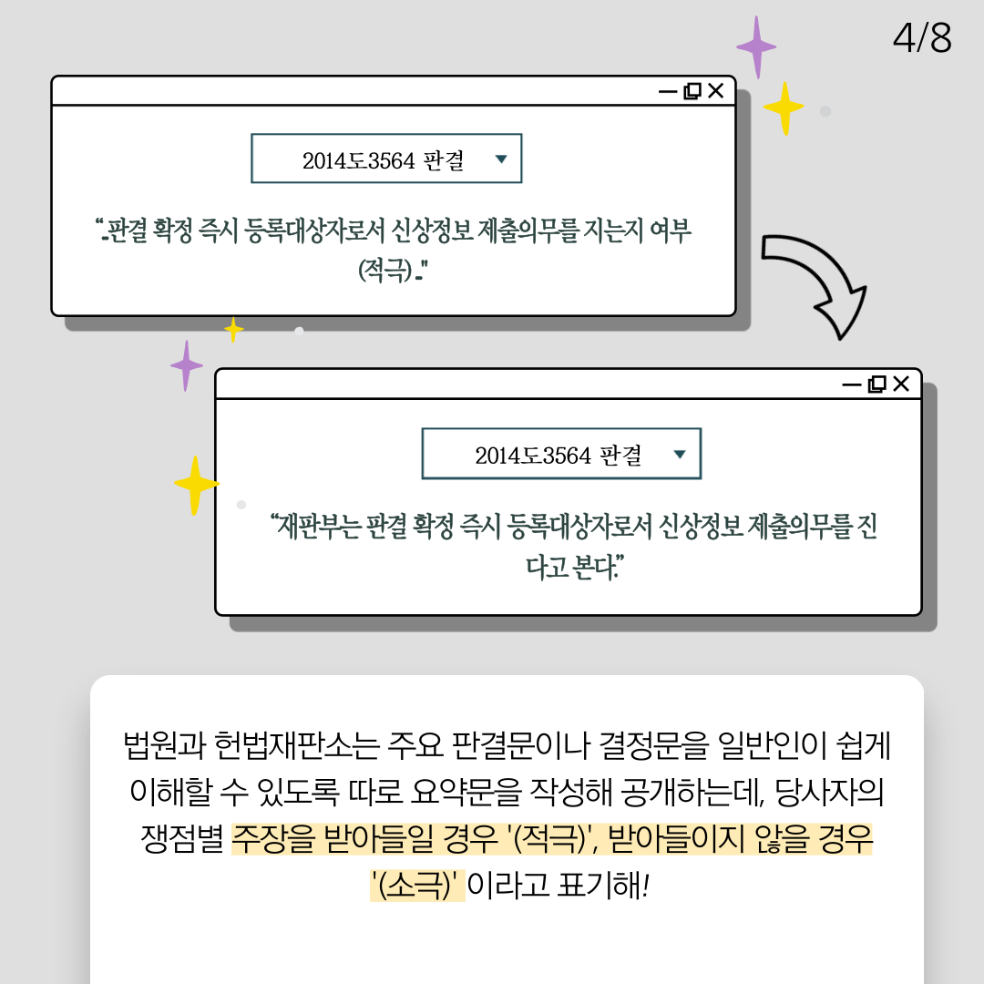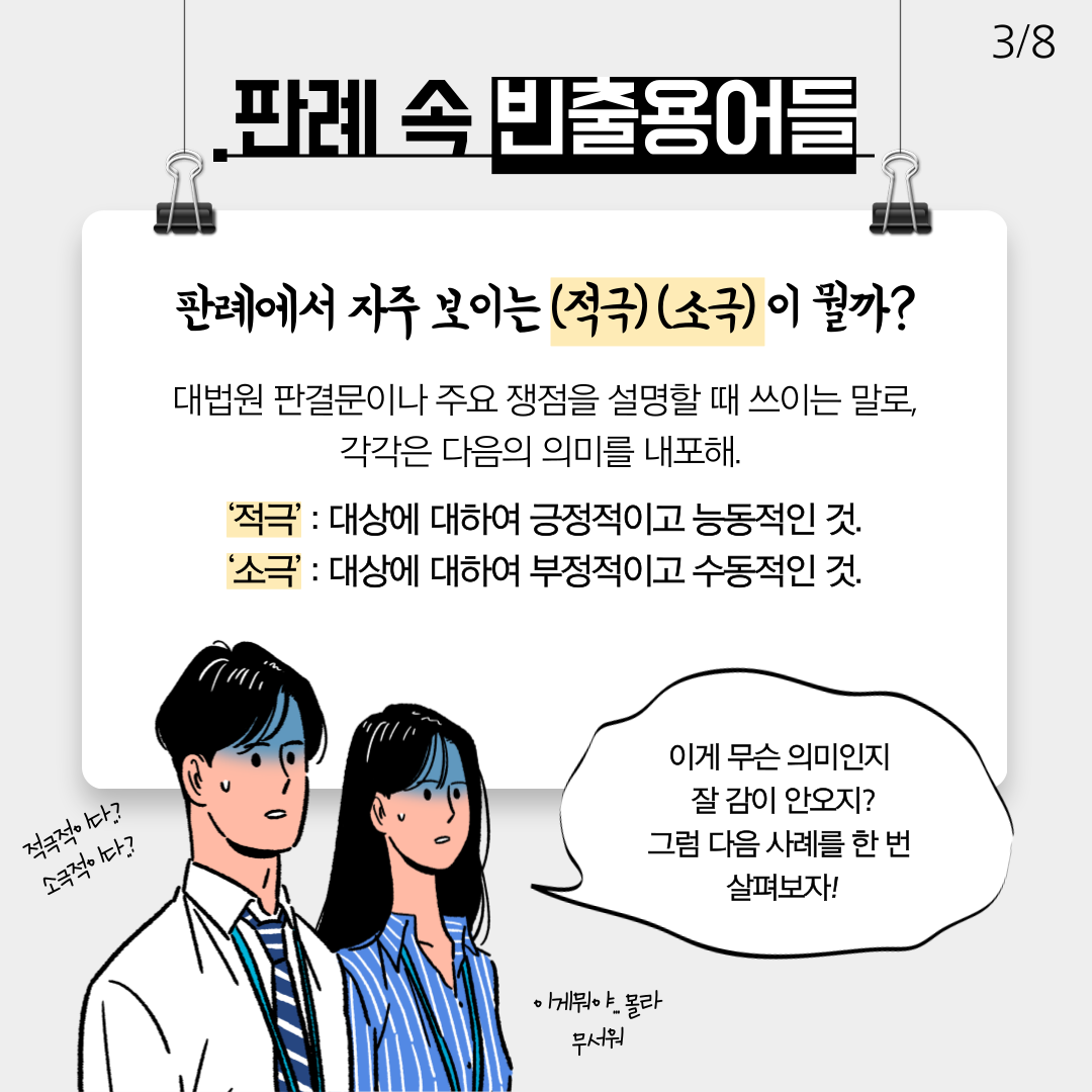 판례를 읽다 보면 “적극” 소극”이라는 단어들이 나옵니다. 이는 대법원이 판결문이나 주요 쟁점을 설명할 때 쓰이는 말로 각각은 다음과 같은 의미를 내포합니다. 적극은 대상에 대해 긍정적이고 능동적인 것을, 소극은 대상에 대해 부정적이고 수동적인 것을 의미합니다.