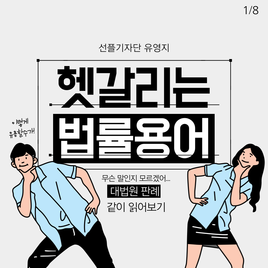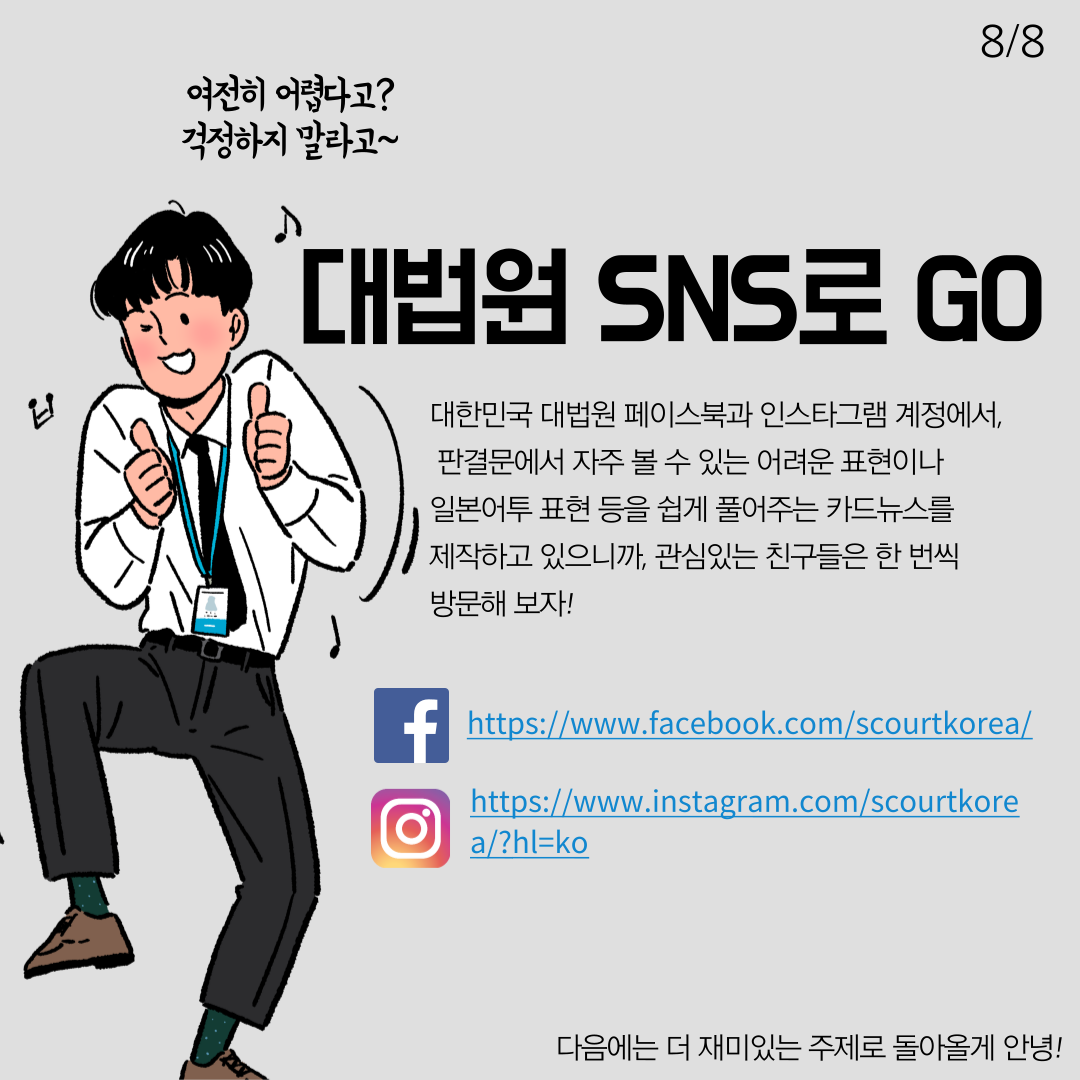 판결 속 법률용어는 한자여와 일본어투 표현들이 그대로 사용되고 있어 일반인이 접근하기 힘들다는 평가를 받아왔습니다. 대한민국 대법원 페이스북과 인스타그램 계정에서, 판결문에서 자주 볼 수 있는 어려운 표현이나 일본어투 표현을 쉽게 풀어주는 카드뉴스를 제작하고 있으니, 관심있는 분들은 한 번 방문해보시길 바랍니다. 다음에도 더 좋은 주제로 돌아오겠습니다!