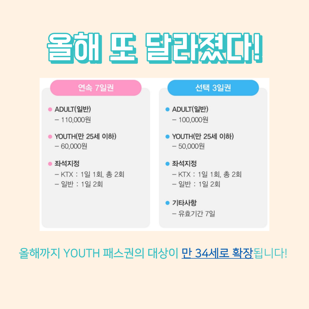 이런 내일로 2.0이 올해에 한 번 더 달라졌습니다. 원래 YOUTH패스권이 만 25세까지였지만 올해까지만 한시적으로 대상이 만 34세로 확장됩니다.