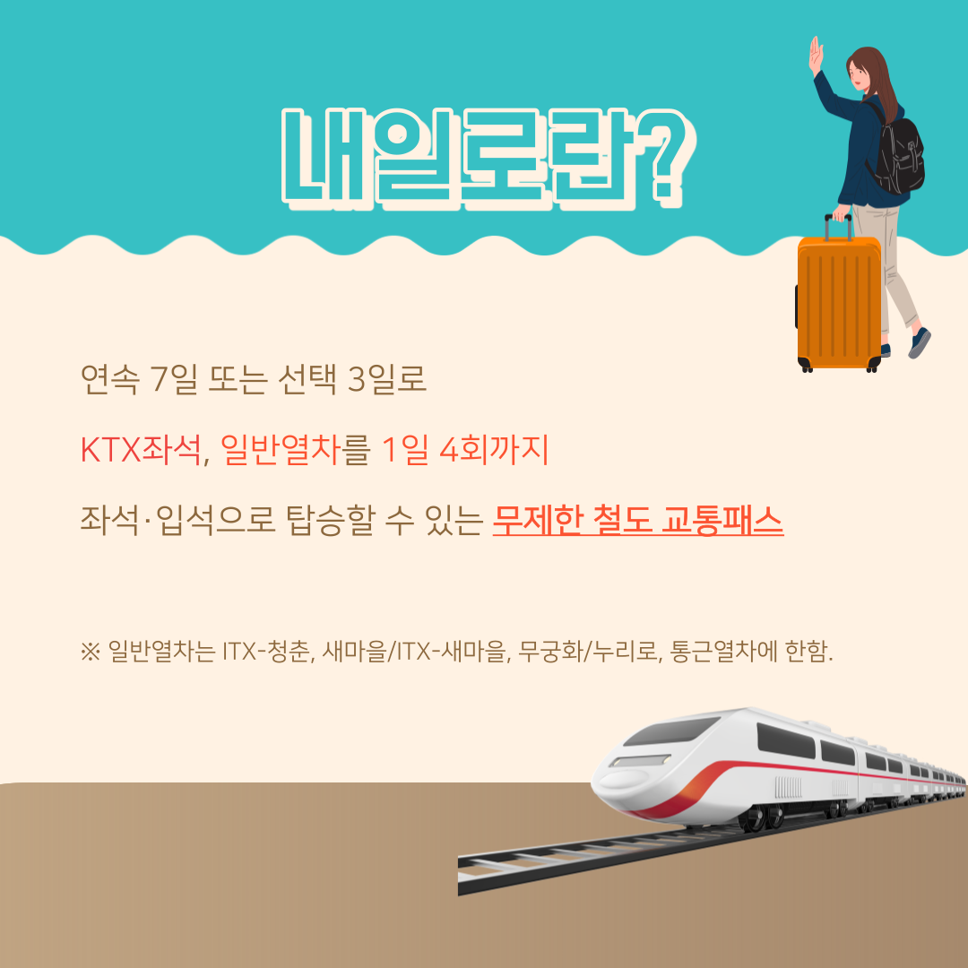 내일로란, 연속 7일 또는 선택 3일로 KTX좌석과 일반열차를 1일 4회까지 좌석·입석으로 탑승할 수 있는 무제한 철도 교통패스입니다. 단, 일반열차는 ITX-청춘, 새마을/ITX-새마을, 무궁화/누리로, 통근열차에 한하고 있습니다.