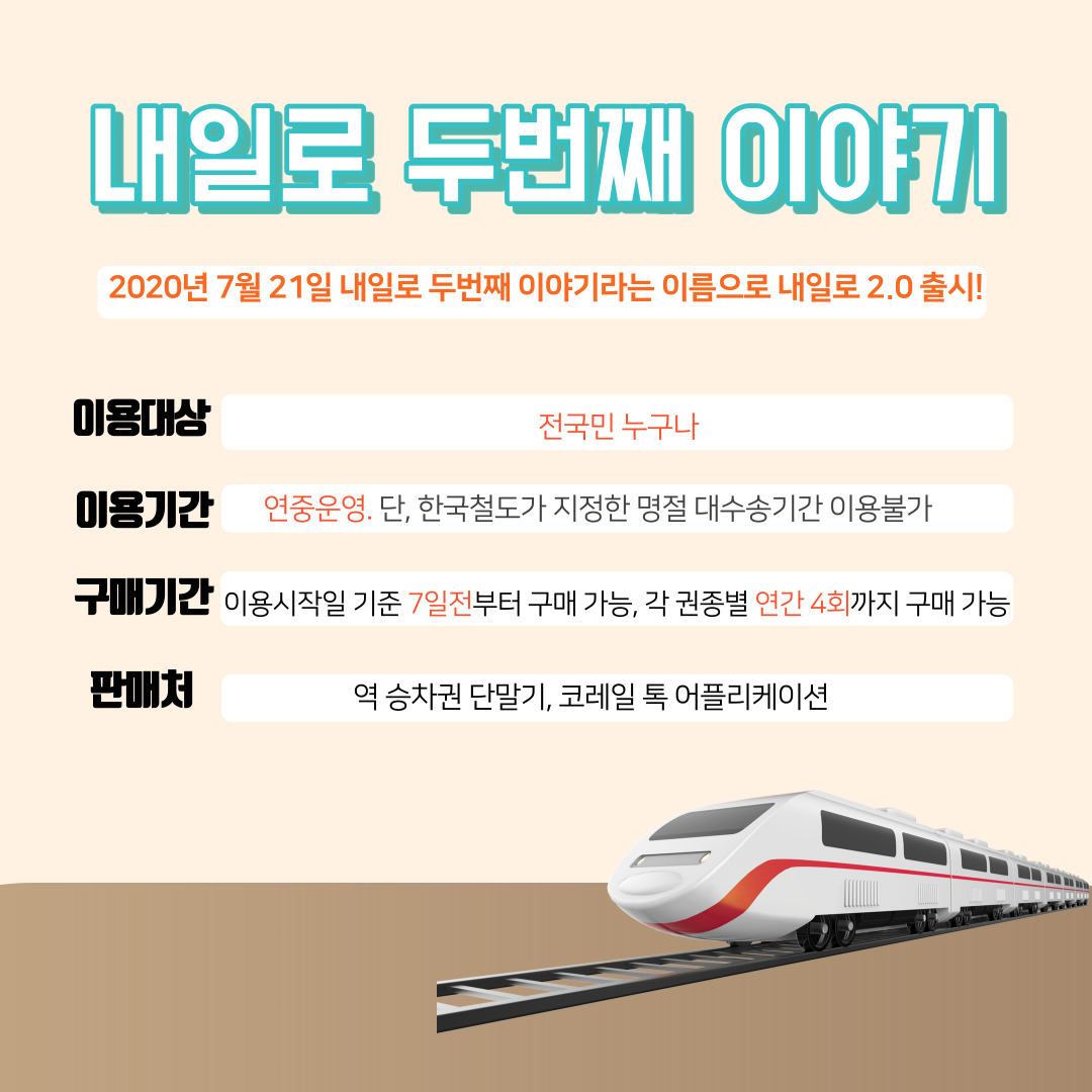 내일로 두 번째 이야기, 즉 내일로 2.0이 2020년에 출시됐습니다. 전 국민 누구나 이용할 수 있고, 연중운영하고 있어요. 하지만 추석과 설날 등 명절 대수송기간엔 이용할 수 없습니다. 또, 이용 시작일 기준 7일전부터 구매가 가능하고, 각 권종 별 연간 4회까지만 구매할 수 있습니다. 그리고 이 내일로 티켓은 역 승차권 단말기에서, 그리고 온라인으로는 코레일 톡 어플리케이션으로 구매할 수 있습니다.