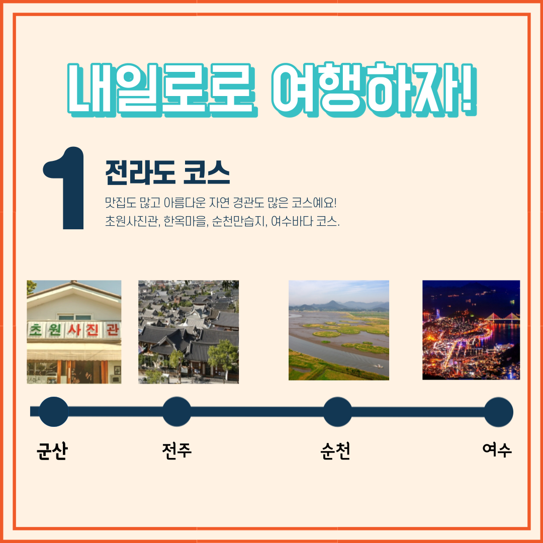 내일로 추천 여행 코스입니다. 먼저, 전라도 코스입니다. 군산을 시작으로 전주, 순천, 여수으로 가는 코스가 있습니다. 군산의 초원사진관에서 사진도 찍고, 전주 한옥마을을 체험하며, 순천만 습지와 여수 밤바다에서 자연경관 및 야경을 구경할 수 있습니다.