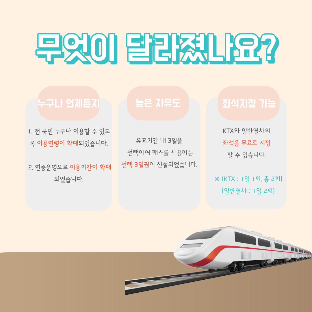그렇다면 무엇이 달라졌을까요? 첫째, 이용연령과 이용기간이 확대됐습니다. 둘째, 유효 기간 내 3일을 선택하여 패스를 사용하는 선택 3일 권이 신설됐습니다. 셋째, KTX와 일반열차의 좌석을 무료로 지정할 수 있게 됐습니다.