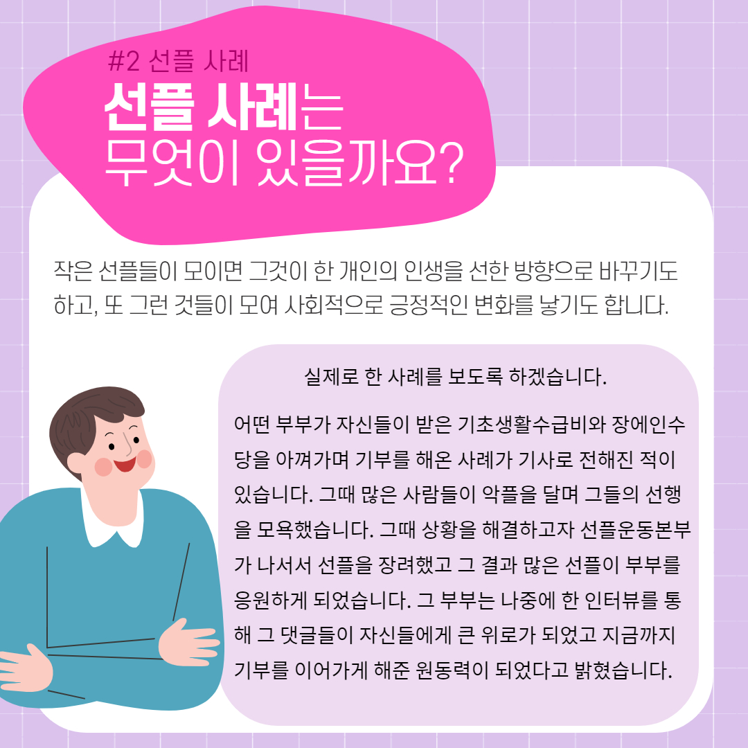 작은 선플들이 모이면 그것이 한 개인의 인생을 선한 방향으로 바꾸기도 하고 또 그런 것들이 모여 사회적으로 긍정적인 변화를 낳기도 합니다. 실제로 한 사례를 설명해보겠습니다. 어떤 부부가 자신들이 받은 기초생활수급비와 장에인수당을 아껴가며 기부를 해온 사례가 기사로 전해진 적이 있습니다. 그때 많은 사람들이 악플을 달며 그들의 선행을 모욕했습니다. 그때 상황을 해결하고자 선플운동본부가 나서서 선플을 장려했고 그 결과 많은 선플이 부부를 응원하게 되었습니다. 그 부부는 나중에 한 인터뷰를 통해 그 댓글들이 자신들에게 큰 위로가 되었고 지금까지 기부를 이어가게 해준 원동력이 되었다고 밝혔습니다.