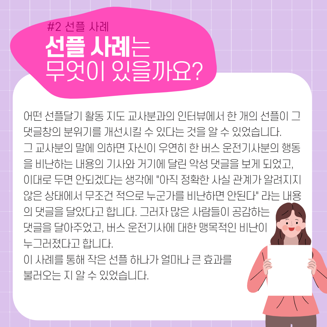 또 다른 사례로는 어떤 선플달기 활동 지도 교사분과의 인터뷰에서 한 개의 선플이 그 댓글창의 분위기를 개선시킬 수 있다는 것을 알 수 있었습니다. 그 교사분의 말에 의하면 자신이 우연히 한 버스 운전기사분의 행동을 비난하는 내용의 기사와 거기에 달린 악성 댓글을 보게 되었고, 이대로 두면 안되겠다는 생각에 "아직 정확한 사실 관계가 알려지지 않은 상태에서 무조건 적으로 누군가를 비난하면 안된다" 라는 내용의 댓글을 달았다고 합니다. 그러자 많은 사람들이 공감하는 댓글을 달아주었고, 버스 운전기사에 대한 맹목적인 비난이 누그러졌다고 합니다. 이 사례를 통해 작은 선플 하나가 얼마나 큰 효과를 불러오는 지 알 수 있었습니다.