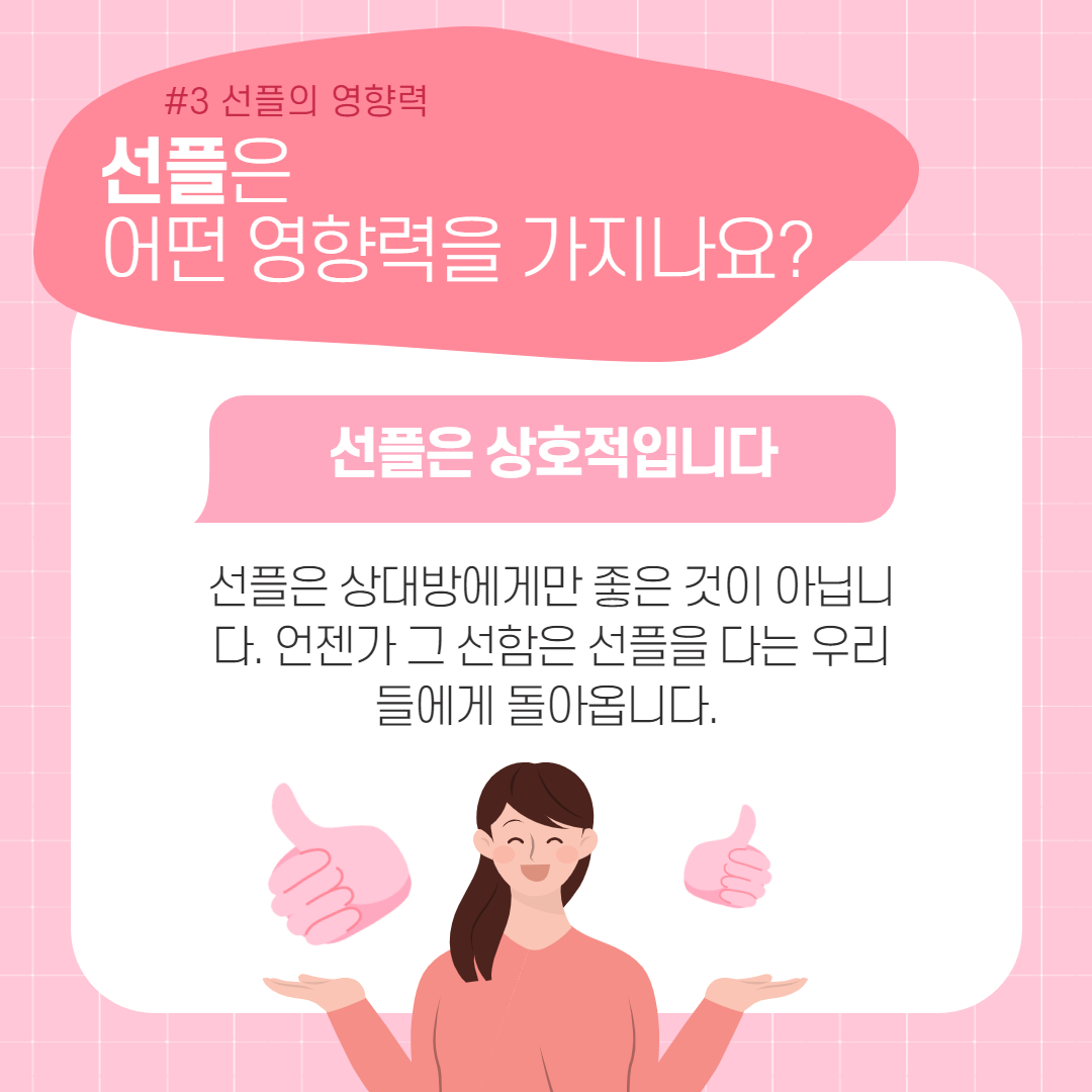선플은 상호적인 것입니다. 선플은 단순히 상대방에게만 좋은 것이 아니라 언젠가 그 선한 영향력이 선플을 다는 우리들에게 돌아옵니다.