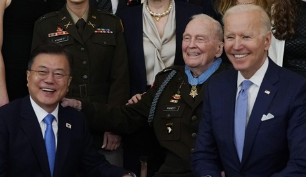 그런데, 5월 21일 문재인 대통령을 맞이한 바이든은 마스크를 쓰지 않고, 한국전쟁 참전용사에게 명예훈장을 수여하는 자리에 문재인 대통령을 초청하고, 만찬을 준비하면서 문재인 대통령께서 해산물을 좋아한다는 것을 미리 알고 메뉴를 준비했다고 까지 밝히며 극진한 대접을 하였습니다.