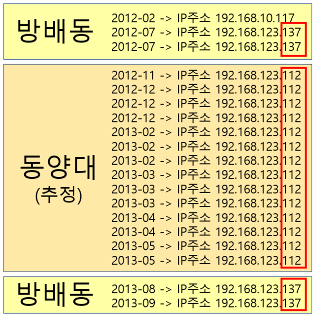 특히 137 아이피와 112 아이피는 사용 기간이 뚜렷하게 구분된다. 137 아이피는 2012년 7월까지 기록이 있다가 1년이 넘은 2013년 8월에 다시 나타납니다. 그 사이에 112 아이피가 14회 접속한 기록이 확인됐습니다.