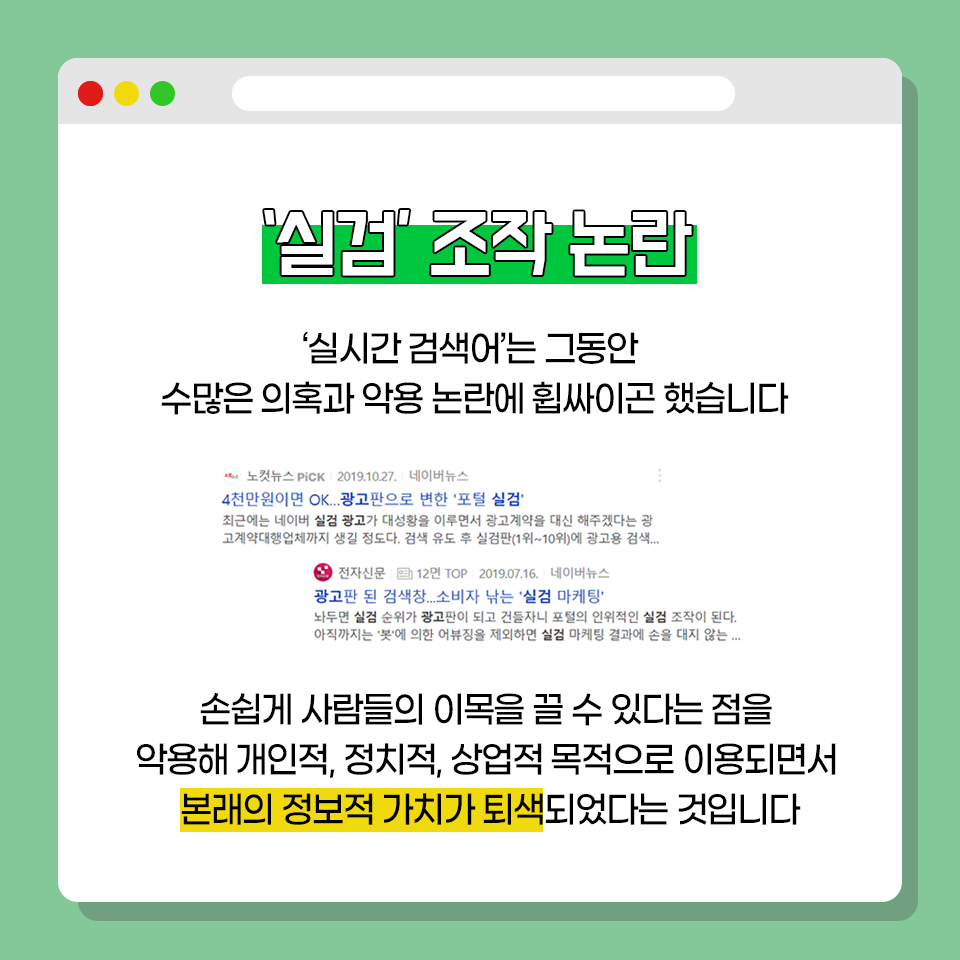 2. 실검 조작 논란: ‘실시간 검색어’는 그동안 수많은 의혹과 악용 논란에 휩싸이곤 했습니다. 손쉽게 사람들의 이목을 끌 수 있다느 점을 악용해 개인적, 정치적, 상업적 목적으로 이용되면서 본래의 정보적 가치가 퇴색되었다는 것입니다.