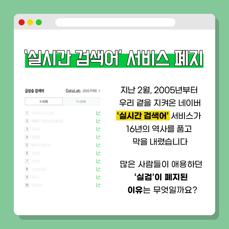 1. 실시간 검색어 서비스 폐지: 지난 2월, 2005년부터 우리 곁을 지켜온 네이버 ‘실시간 검색어’ 서비스가 16년의 역사를 품고 막을 내렸습니다. 많은 사람들이 애용하던 ‘실검’이 폐지된 이유는 무엇일까요?