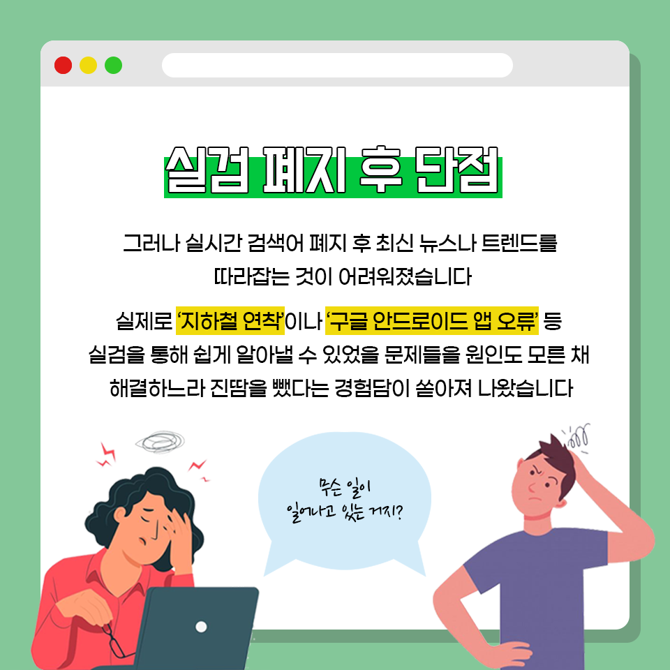 5. 실검 폐지 후 단점: 그러나 실시간 검색어 폐지 후 최신 뉴스나 트렌드를 따라잡는 것이 어려워졌습니다. 실제로 ‘지하철 연착’이나 ‘구글 안드로이드 앱 오류’ 등 실검을 통해 쉽게 알아낼 수 있었을 문제들을 원인도 모른 채 해결하느라 진땀을 뺐다는 경험담이 쏟아져 나왔습니다.
