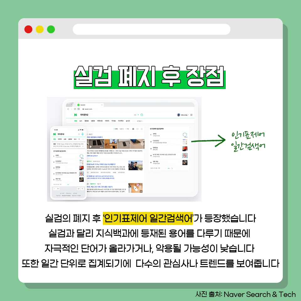 4. 실검 폐지 후 장점: 실검의 폐지 후 ‘인기표제어 일간검색어’가 등장했습니다. 실검과 달리 지식백과에 등재된 용어를 다루기 때문에 자극적인 단어가 올라가거나, 악용될 가능성이 낮습니다. 또한 일간 단위로 집계되기에 다수의 관심사나 트렌드를 보여줍니다.