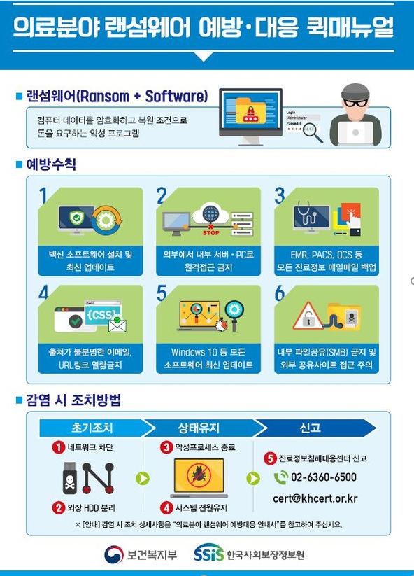 국내 대다수의 의료기관이 전자의무기록시스템(EMR)을 도입하고 있는 만큼 사이버 공격에 대처하기위한 노력을 이미 국가에서는 하고 있었다. 지난해 2월 의료법 개정 시행에 따라, 진료정보 침해사고 신고 접수와 사고 예방 및 대응 업무수행을 위해 설립한 진료정보침해대응센터(Korea Healthcare Computer Emergency Response Team, 일명 KHCERT)을 통해 침해 사고에 대해 신고를 받고, 안티바이러스 소프트웨어 배포와 서비스 지원, 그리고 각종 매뉴얼을 배포하고 있다.