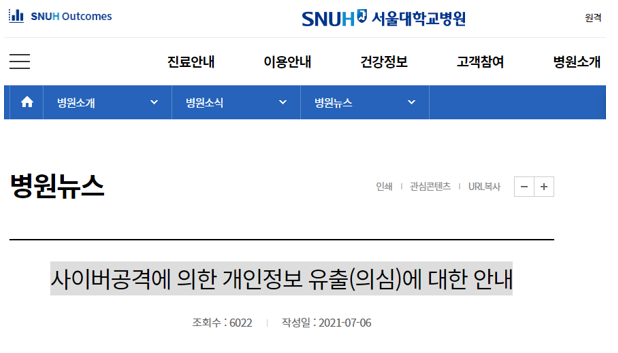 지난 6일, 서울대병원은 공식 홈페이지를 통해 ‘사이버공격에 의한 개인정보 유출(의심)에 대한 안내’ 뉴스를 올려 사고 정황을 밝혔다. 현재는 보완조치 및 관련 기관에 신고를 해 수사와 2차 피해를 예방하기위해 노력 중이다라고 한다. 환자, 직원 등의 상당한 개인정보가 유출되었을 가능성이 있으며 자세한 내용과 개개인의 유출 가능성이 큰 개인정보 사항은 http://www.snuh.org/board/B003/view.do?viewType=true&bbs_no=5581&pageIndex=1&restrictedBbsType=&viewType=true&cate_cd=&searchKey=all&searchWord 에서 확인이 가능하다.
