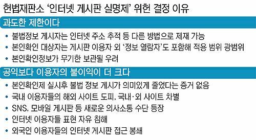 앞서 언급했듯이, 지난 2012년, 헌법재판소는 정보통신망법상 인터넷 게시판 본인확인제에 대해 위헌결정을 내렸다. 여기서 인터넷 게시판 본인확인제란 인터넷 게시판을 설치·운영하는 정보통신서비스 제공자에게 본인확인조치의무를 부과해 게시판 이용자로 하여금 본인확인 절차를 거쳐야만 게시판을 이용하거나 정보를 게시할 수 있도록 하는 제도를 의미한다. 헌재는 해당 법안이 헌법상 기본권인 (익명)표현의 자유와 개인정보 자기 결정권을 침해할 뿐만 아니라, 정보통신서비스 제공자 등 관련 사업자에 대한 과도한 규제를 부과한다는 입장을 표명하며 해당 법안이 과잉금지원칙에 위배된다고 보았다.