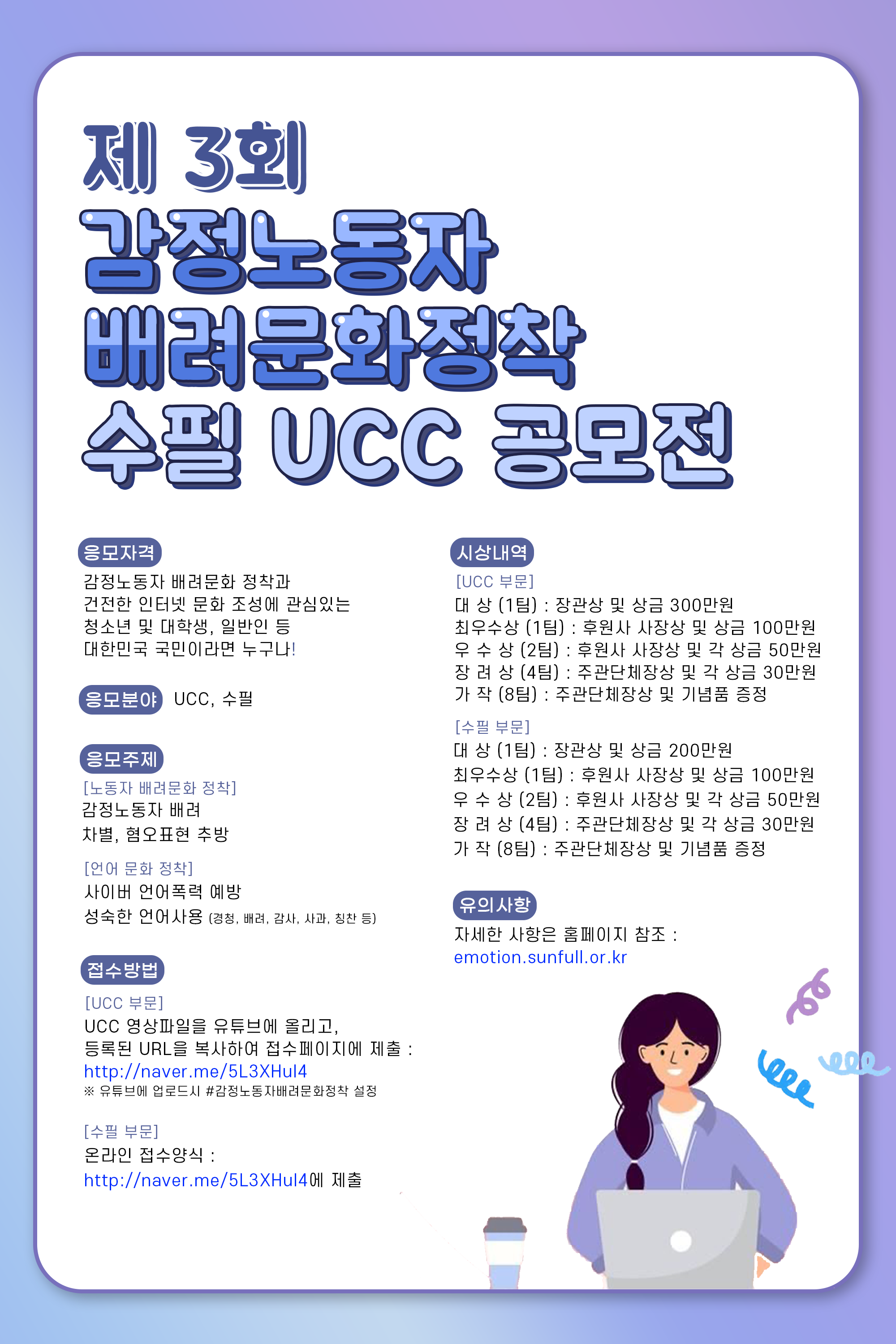 - (재)선플재단 감정노동자 배려문화정착 UCC공모전 담당 ☎ 02-535-3449