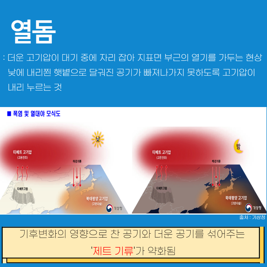 기후변화의 영향으로 찬 공기와 더운 공기를 섞어주는 ‘제트기류’가 약화된 탓에 열돔이 생겼다는 분석이 있는데 한반도의 경우에는 북태평양 고기압과 티베트 고기압이 이에 해당한다.