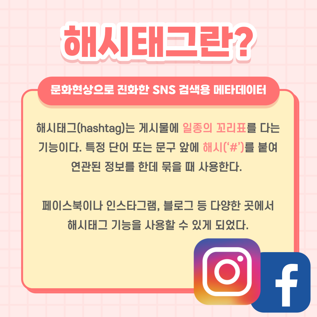 해시태그를 요약해서 말하자면 문화현상으로 진화한 SNS 검색용 메타데이터를 말합니다. 해시태그는 게시물에 일종의 꼬리표를 다는 기능이며 특정 단어 또는 문구 앞에 해시(‘#)를 붙여 연관된 정보를 한데 묶을 때 사용합니다. 해시태그 기능은 페이스북이나 인스타그램, 블로그 등 다양한 곳에서 사용할 수 있게 되었습니다.