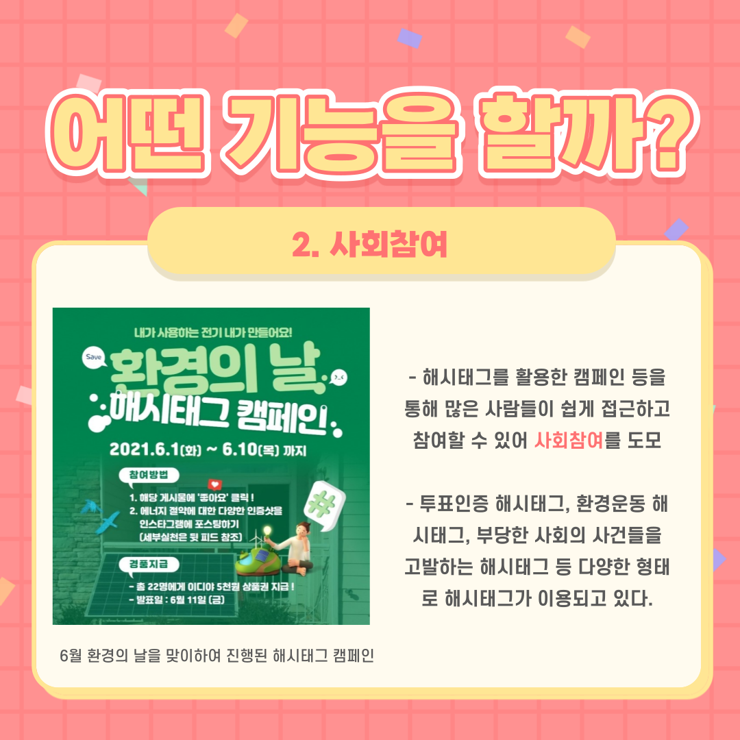 두 번째로 해시태그는 사람들의 사회참여를 도모할 수 있습니다. 해시태그를 활용한 캠페인 등은 많은 사람들이 쉽게 접근하고 참여할 수 있기에 사회참여를 도모할 수 있는 좋은 수단이 되었습니다. 현재 투표인증 해시태그, 환경운동 해시태그, 부당한 사회의 사건들을 고발하는 해시태그 등 다양한 형태로 해시태그가 이용되고 있습니다.