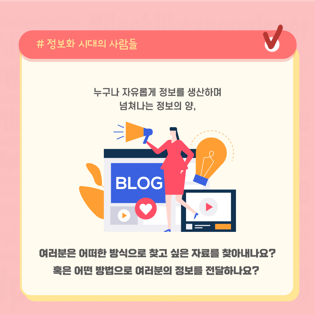 누구나 자유롭게 정보를 생산하며 정보의 양은 넘쳐나게 되었습니다. 여러분들은 이렇게 많은 정보들 중 어떠한 방식으로 찾고 싶은 자료를 찾아내나요? 혹은 어떤 방법으로 여러분들이 전하고 싶은 정보를 전달하나요?