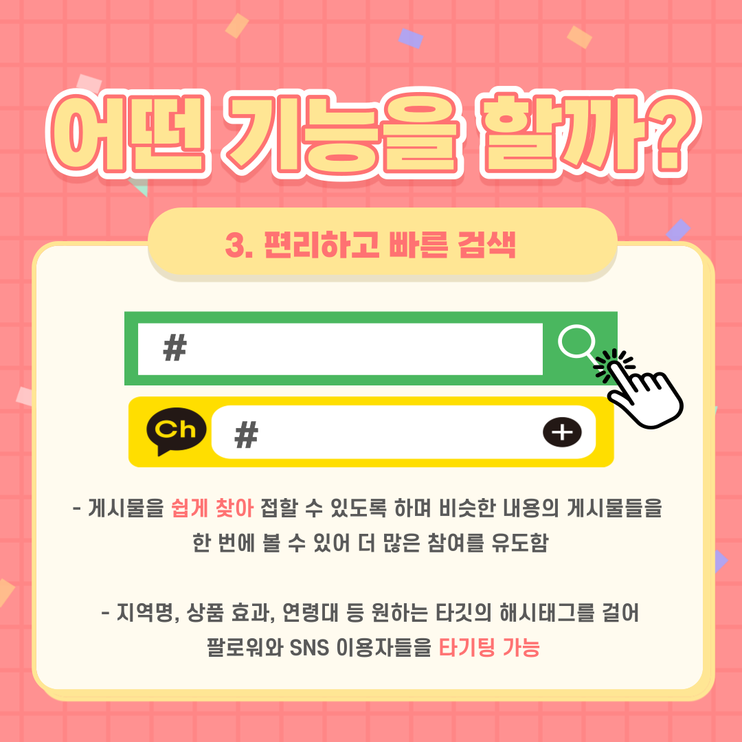 세 번째로 해시태그는 편리하고 빠른 검색을 돕습니다. 해시태그는 게시물을 쉽게 찾아 접할 수 있도록 하며 비슷한 내용의 게시물들을 한 번에 볼 수 있어 사람들의 더 많은 참여를 유도하고 있습니다. 지역명, 상품 효과, 연령대 등 원하는 타깃의 해시태그를 걸어 팔로워와 SNS 이용자들을 타기팅 가능하도록 하고 있습니다.